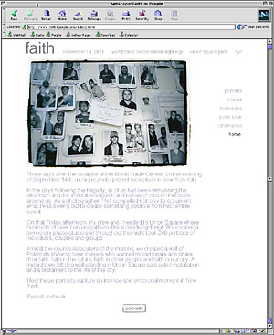 Development: LaDonna Myroth. Three days after the collapse of the World Trade Center, on the evening of September 14th, a unique photo project took place in New York City. In the days following the tragedy, all of us had been witnessing the aftermath and the incredible anguish and sense of loss on the faces around us. As a photographer, I felt compelled not only to document what I was seeing but to create something positive from this terrible event. On that Friday afternoon, my crew and I headed to Union Square where hundreds of New Yorkers gathered for a candle light vigil. We created a temporary photo studio and throughout the night took 200 portraits of individuals, couples, and groups. Amidst the countless posters of the missing, we created a wall of Polaroids showing New Yorkers who wanted to participate and share their faith: faith in the future, faith in other people and faith in our city. At midnight we left this wall standing in Union Square as a public installation and a testament to the life of the city. In order to make the portraits available for everyone to see we created a website called "www.faithinpeople.com." I feel these portraits capture an intense and emotional moment in New York. Svend Lindbaek |