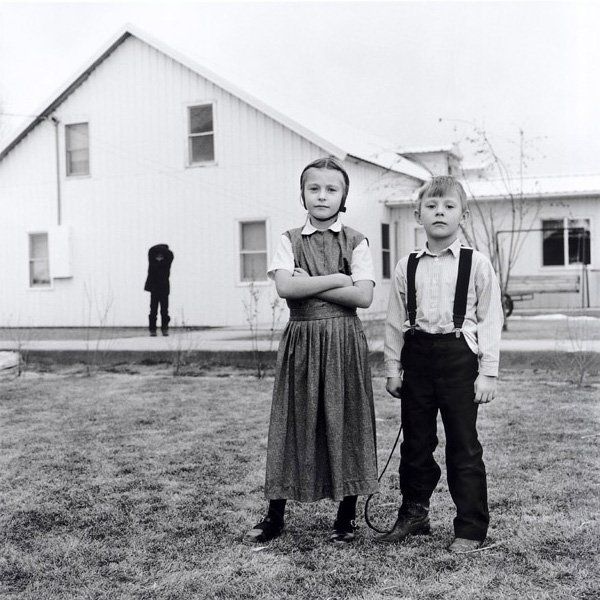 Julie Melton, Crystal and Travis, Deerfield Hutterite Colony, 2003, Gelatin silver print, 14 x 14 inches, Courtesy of the artist Hutterite children are given responsibilities such as setting the kids' table and washing dishes at an early age, but still have plenty of time to play. |