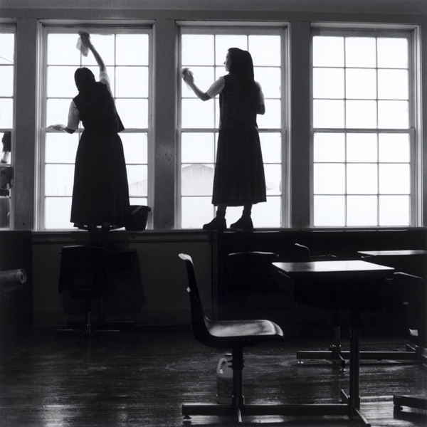 Julie Melton, Cleaning the Church, Deerfield Hutterite Colony, 2003, Gelatin silver print, 14 x 14 inches, Courtesy of the artist In the Hutterite Colony, the church is used for both worshipping and formal German classes. The sermons are performed in High German, however in daily speech the Hutterites use an Austro-Bavarian dialect. Formal teaching of English begins in kindergarten in the colony school. |