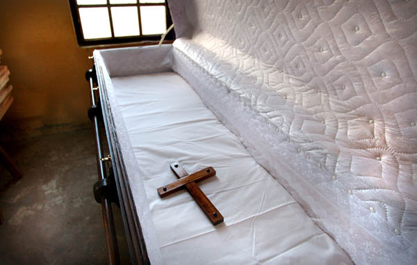 Inmate made coffin, fellow inmates in the wood shop make many of the coffins used for burial within the prison cemetery.