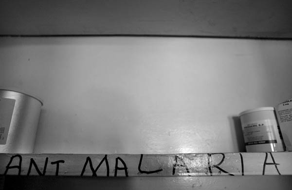 Pharmaceutical storage shelf located in aclinic, where the much needed chloroquine is missing due to the high cost of the drug.