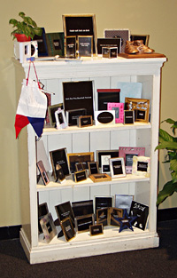 Evans encourages each exhibiting venue to locate furnishings and create spaces for which she provides the trinkets and trophies. In installing this work, I as curator imitate a domestic version of museum practice. I recall how photographs are displayed in my parent’s home: clustered on the television, nestled on the end table, scattered down a hall. Ideas of the index and tracing figure in the photographs as well as several quintessential accessories (bronzed baby shoes and plaster of paris handprints). In Evans’s photographs, however, there is no person or object in front of the camera. Swimming against a deep sea of black, the words in Saga could be read as epitaphs. Evans literally gives us a blank slate—names, descriptions, and our own imagination serve to animate the fictitious extended nuclear nexus.