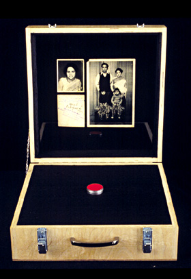 When Priya Kambli moved from India to America in 1993, she could take only what would fit into one suitcase. Her “Suitcase Series” deals with this physical and mental move, and the attendant intellectual editing of snapshots, items, and ultimately memory. Each constructed case deals with a different theme and corresponds to a different hue, incorporating objects and photographs with intricate artisanship.