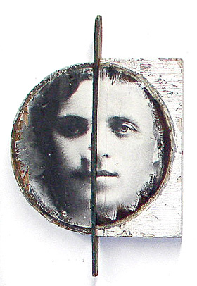 After his narrative color images of his family were included in the Museum of Modern Art’s seminal exhibition Pleasures and Terrors of Domestic Comfort (1991), David Prifti’s work evolved toward mixed media, yet kept the same genealogical focus. Old and new family photographs now adorn decayed and decrepit found materials through Prifti’s use of liquid photographic emulsion. Everyday images become haunting, transformed as such into ancestral artifacts and memory talismans. Again and again, the meeting or parting of faces and family surfaces in his creations, and becomes almost chrysalis-like in effect. The fragments in their nature, appearance, and methodology speak of how memory is constructed, deconstructed, obstructed, and reconstructed. One is reminded of ancient roman ruins, the faces of long dead peering from shards and debris.