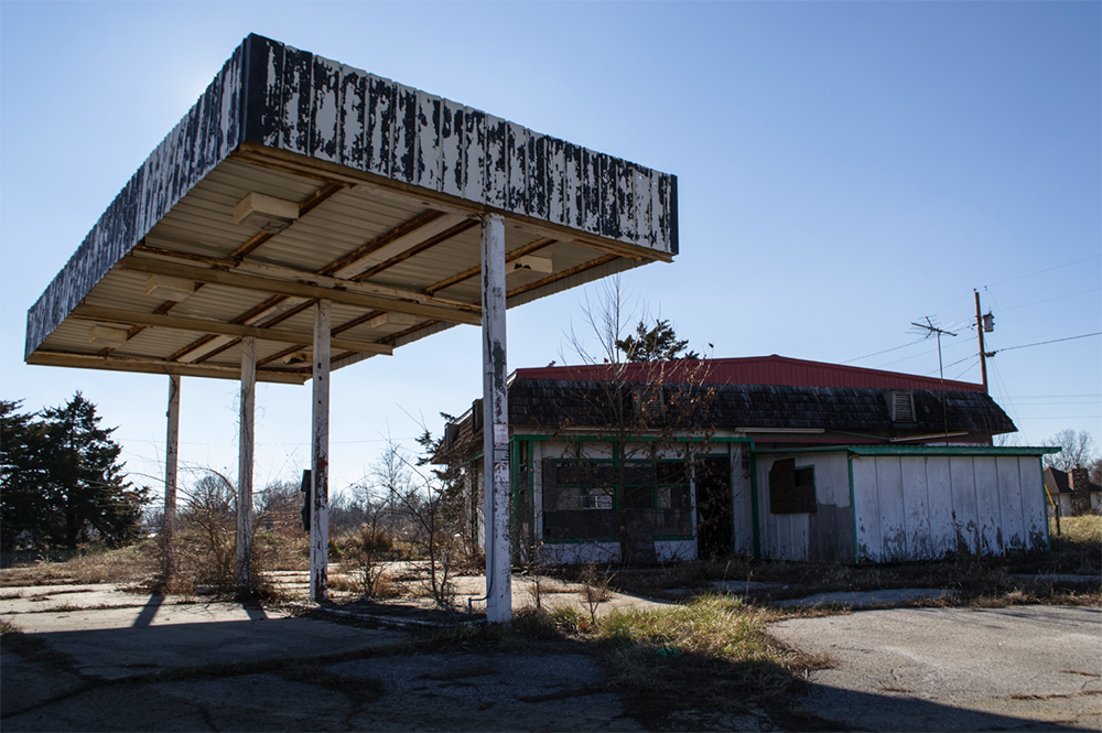 Eric Nichols’ photographs capture domestic moments that may otherwise pass by unnoticed. In their isolated life of the COVID-19 pandemic, husband and wife turned their cameras on each other to explore how they see themselves as they navigated their time in near isolation. Steven Duede’s I-70 series features the relics of service stations found along Interstate 70 between St. Louis and Kansas City Missouri. The lonely, broken structures once had a purpose and have been left to weather the elements and become a disjointed part of the landscape.